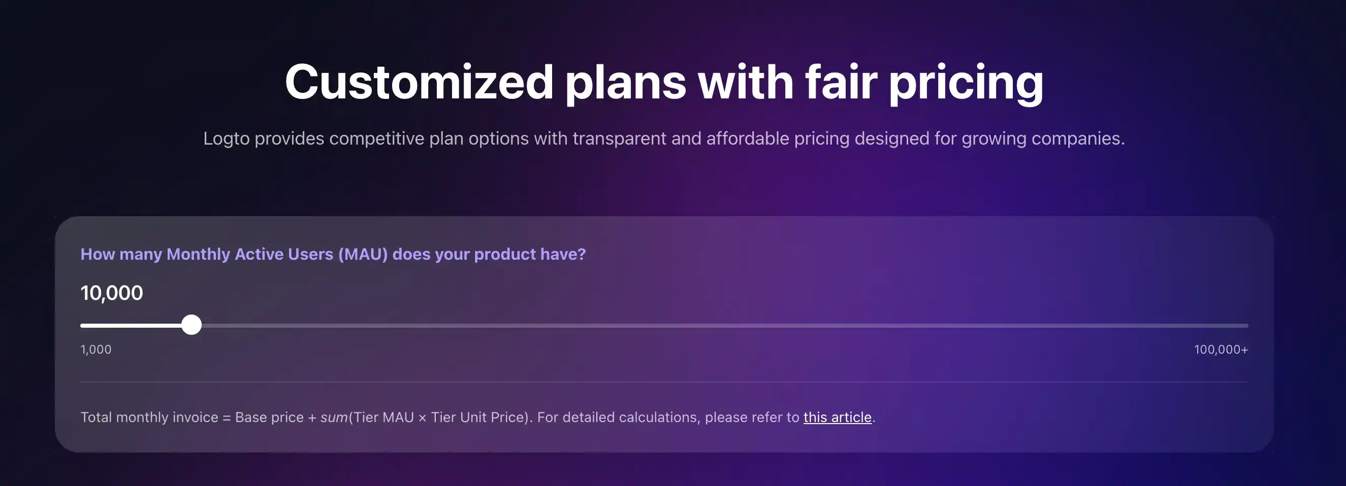 Logto addressed the concerns by offering affordable pricing options and considering user engagement to reduce costs. According to our pricing model and industry standards in terms of the engagement level, we’ve predicted the average company could have a cost of $0.01 per monthly active user (MAU) in the Hobby plan, and $0.03 per MAU in the Pro Plan.