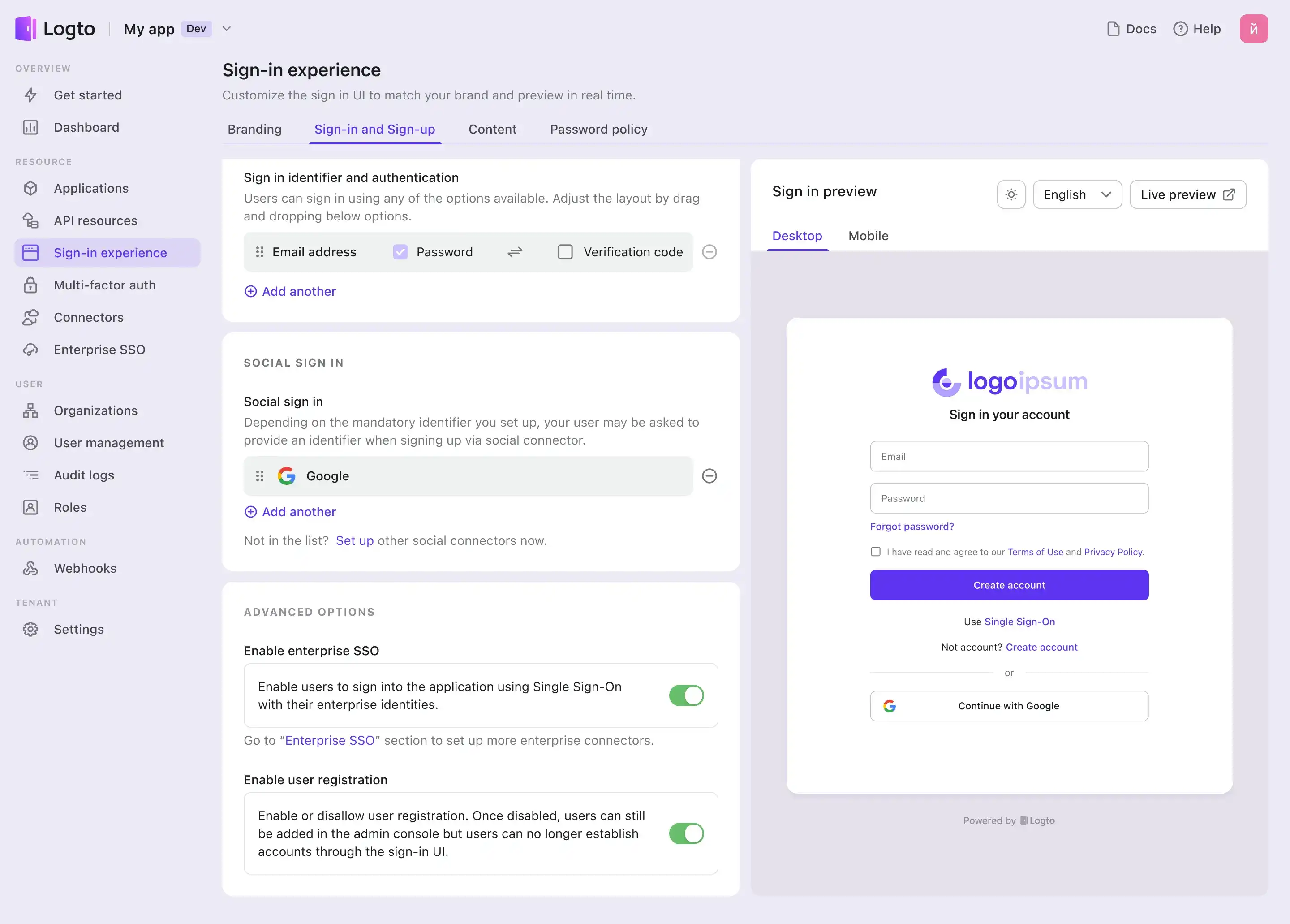 Now, you may test the SSO integration by using the live preview button at the top right corner of the Sign-in Experience preview section.