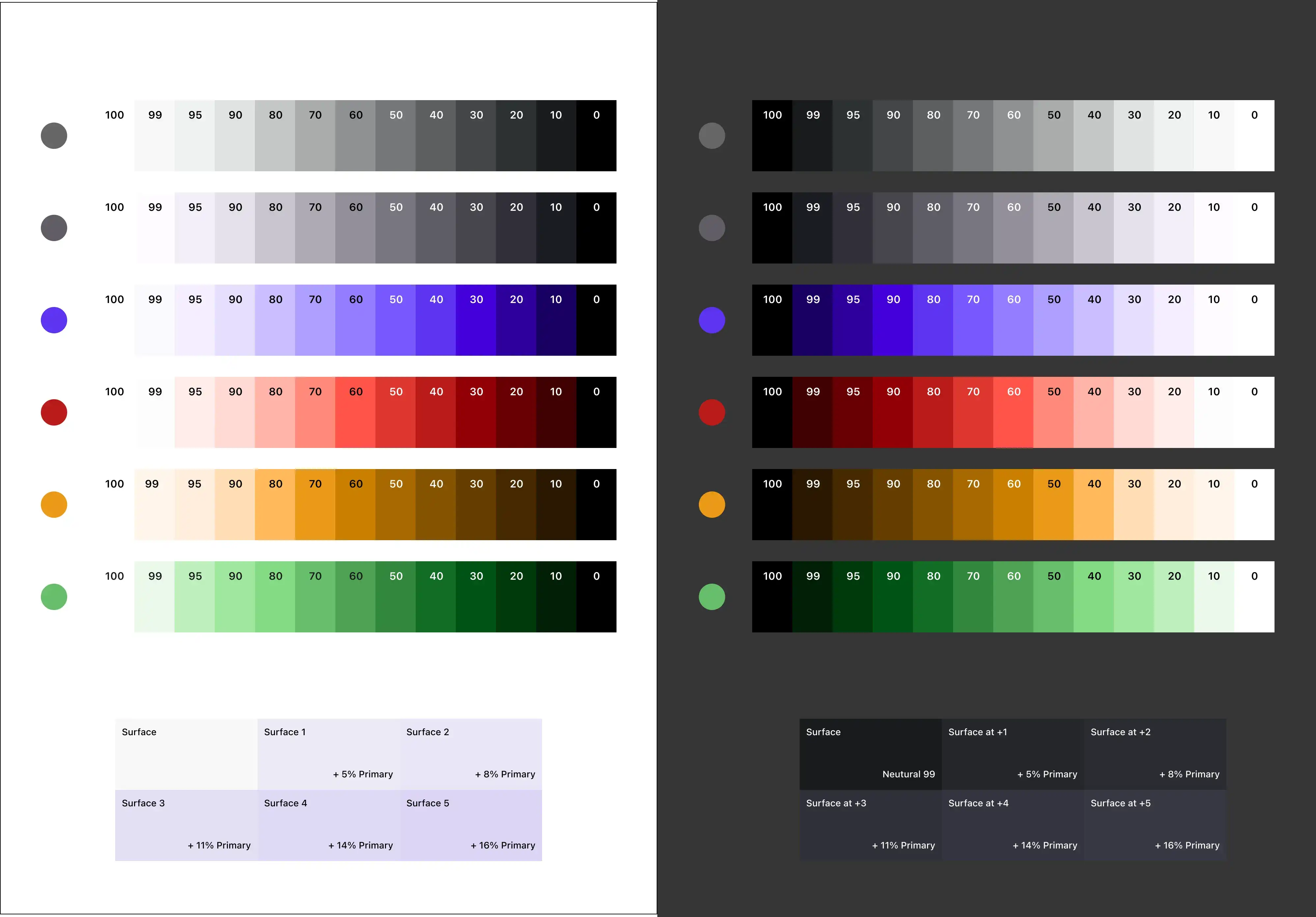 As mentioned earlier, developers may bring their own branding color to generate a custom branding color palette. To achieve this, we provide a simple color calculation unit that takes the base color and generates the corresponding color families.