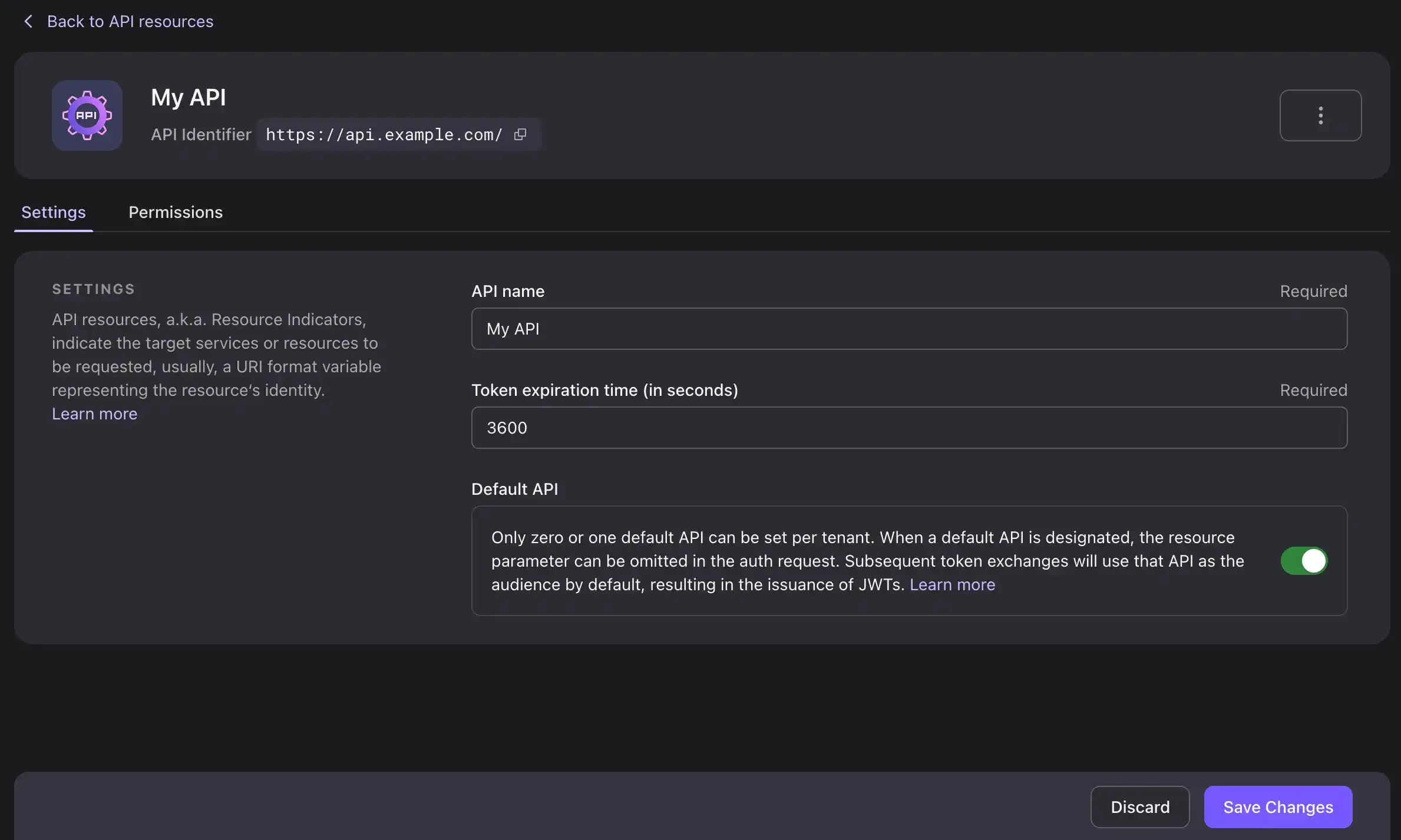 In the modal that appears, enter your API Resource's name and identifier, such as "My API" and https://api.example.com/. Then click on "Create API Resource".