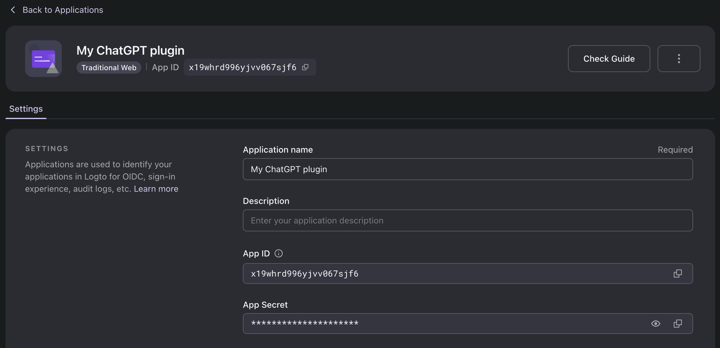 When setting up your plugin with ChatGPT, you will need to provide your OAuth Client ID and Client Secret. These correspond to the βApp IDβ and βApp Secretβ on the Logto page.