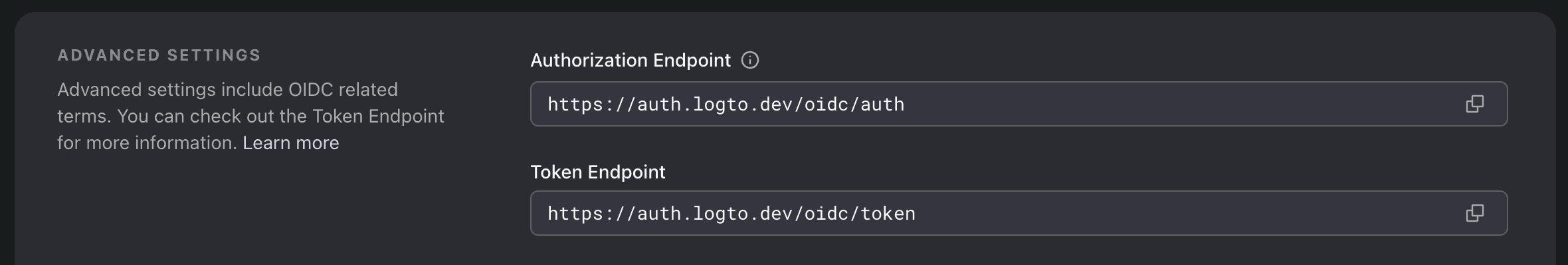 }Remember to replace the client_url and authorization_url values with the respective values from Logto. You can find and copy them from the "Advanced settings" section on the Logto application details page.