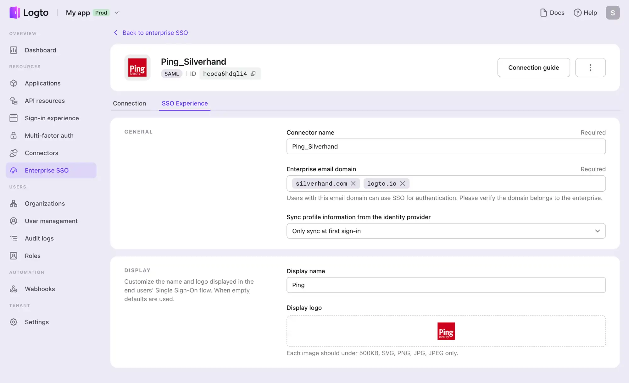 - Personalized interface: Personalize your SSO connector with unique display names and logos. This feature enhances user recognition during one email domain mapping to various SSO connectors. It's optional; if not used, defaults are applied.