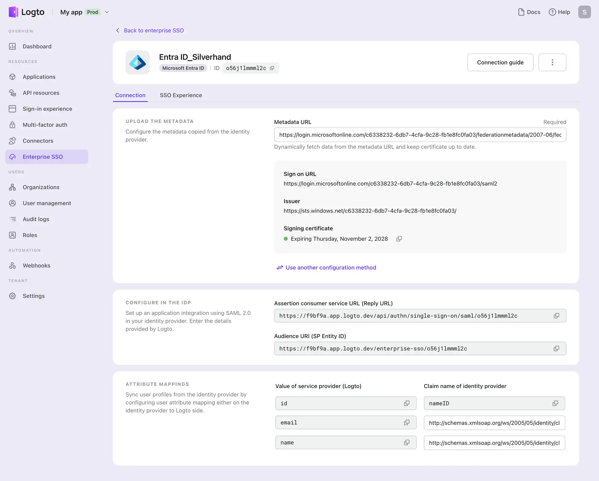 - Flexibility and reliability: Configure using Metadata URL, XML file, or manual entry, ensuring compatibility with various provider requirements. Metadata URL is the simplest because Logto will fetch the metadata details from the URL automatically and auto-update the certificate to the newest.