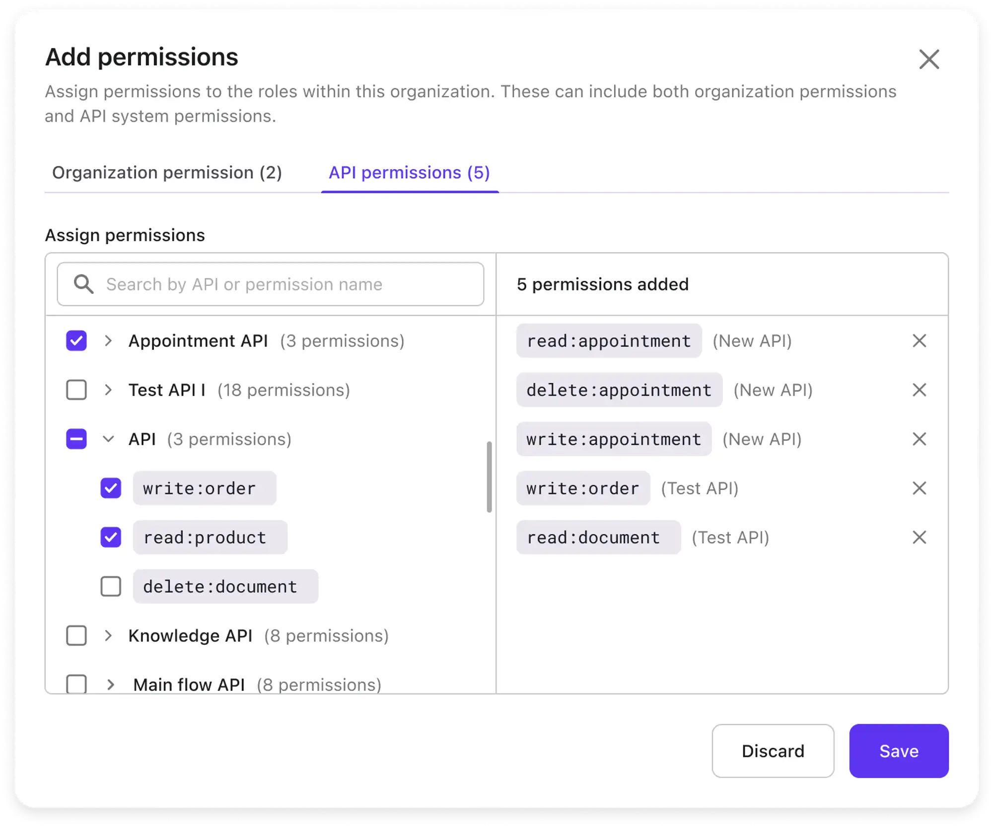 In Logto, you can assign API permissions directly to an organization's role, tailoring it to your specific requirements.