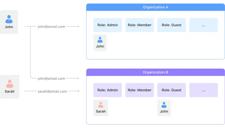 In B2B scenarios, user roles can vary across different organizations. For instance, John might have an admin role in Organization A but only hold a member role in Organization B.