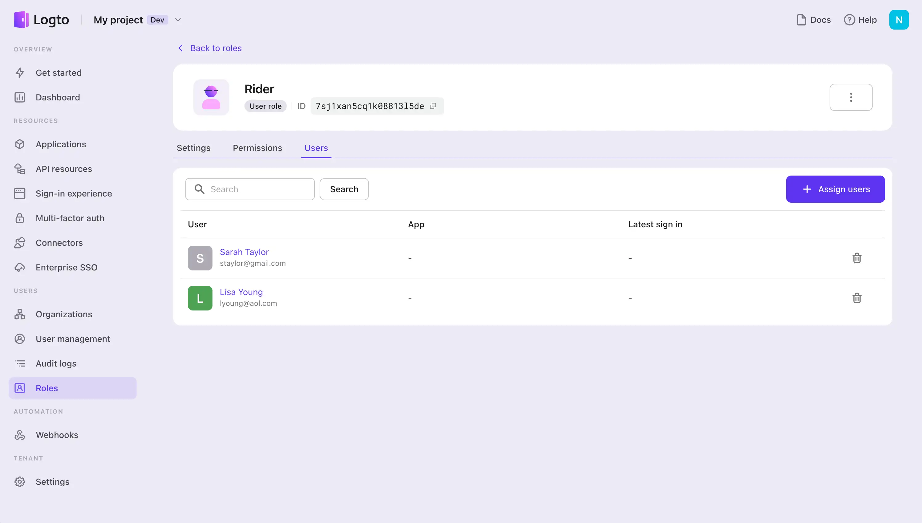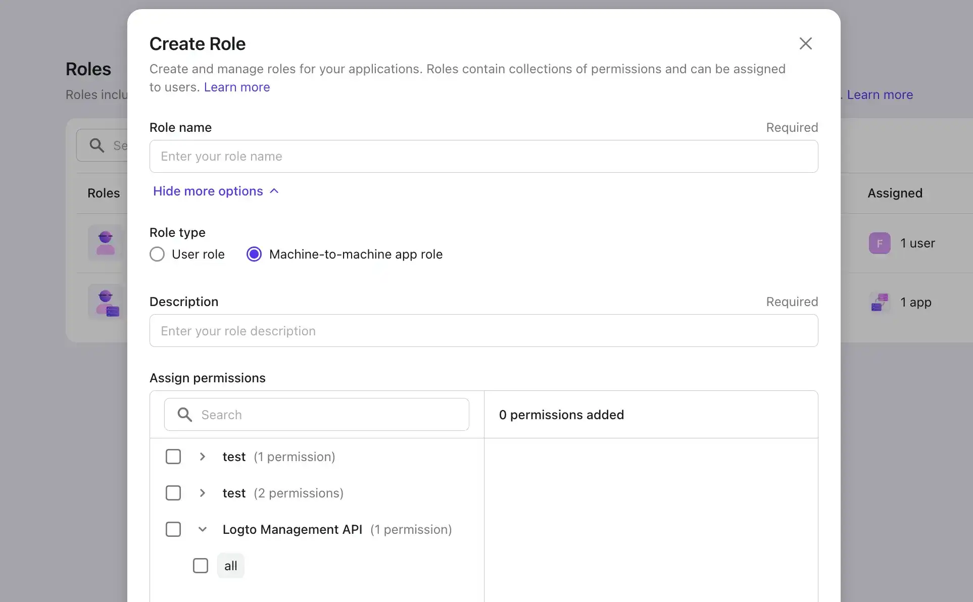 A great feature of Logto is its ability to create various types of roles that can be applied to different entities, including both user and machine-to-machine apps. Users can inherit user-specific roles, while machine-to-machine apps can inherit roles designed for them.