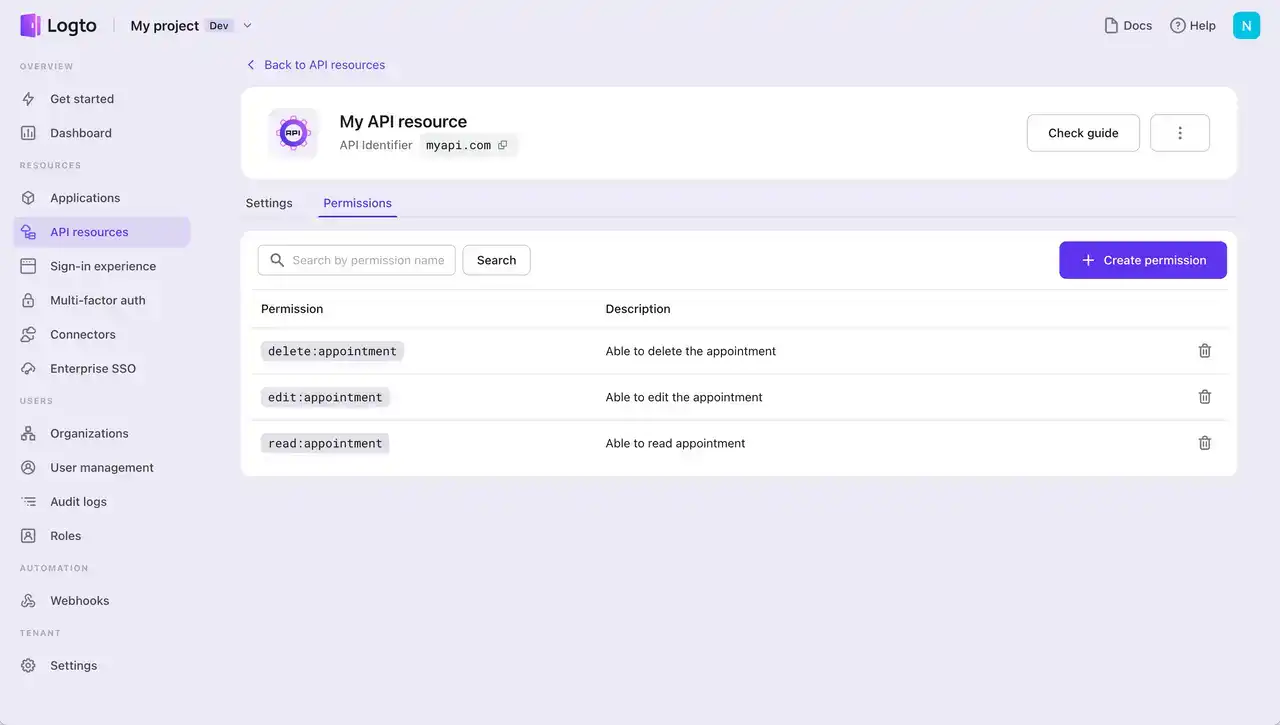 To establish an authorization system where different users have varying access to resources and action permissions, you can start by registering the API resource in Logto and then add permissions. Utilize roles to aggregate these permissions, whether for a single API or across multiple ones.