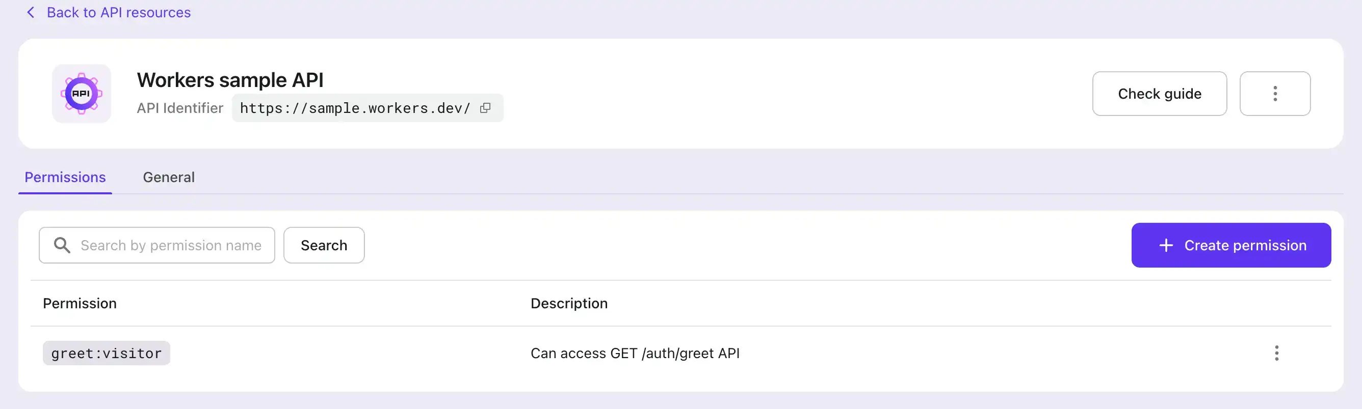 https://sample.workers.dev/. Also create a permissiongreet:visitorfor this API resource.
