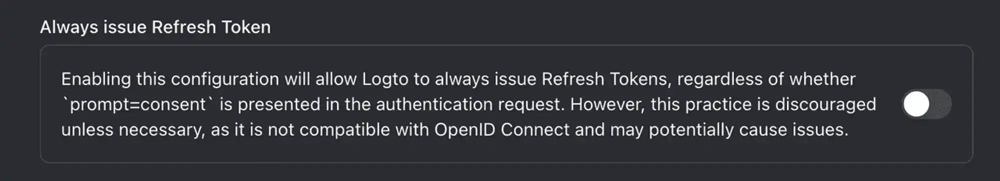 Some products may require a Refresh Token when sending token exchange requests to Logto. For OAuth, you only need to make sure the offline_access scope is included. According to the OIDC protocol, by default, the product must also add the prompt=consent search parameter in the initial authorization request for the Authorization Code flow; otherwise, no Refresh Token will be issued.