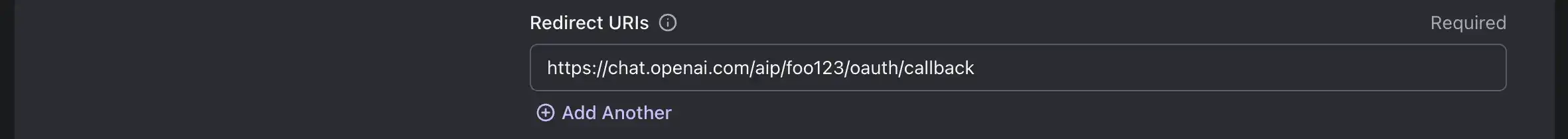 In the "Redirect URIs" section, enter the value provided in the product documentation. Usually, it is dynamic based on your ID or endpoint configuration in the product. For example, in ChatGPT plugins, the Redirect URI is: