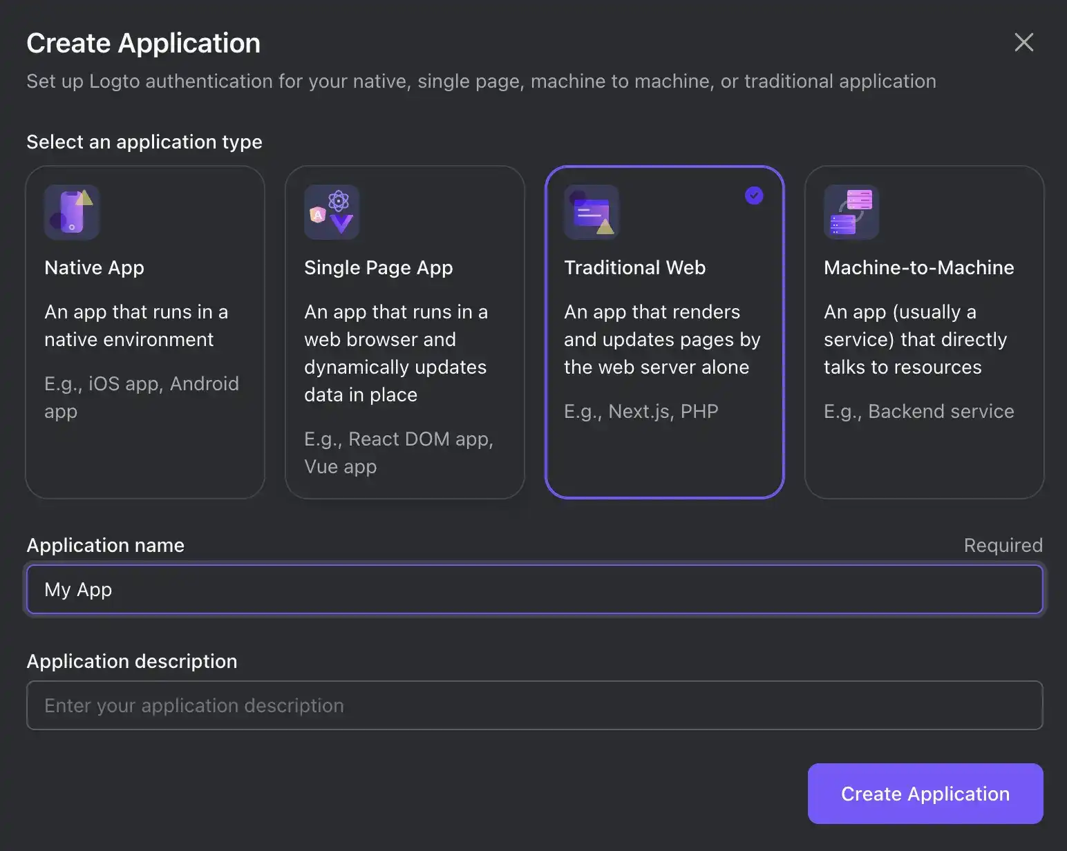 In the modal that appears, choose "Traditional Web" and provide an application name, such as "My App". Click on "Create application".