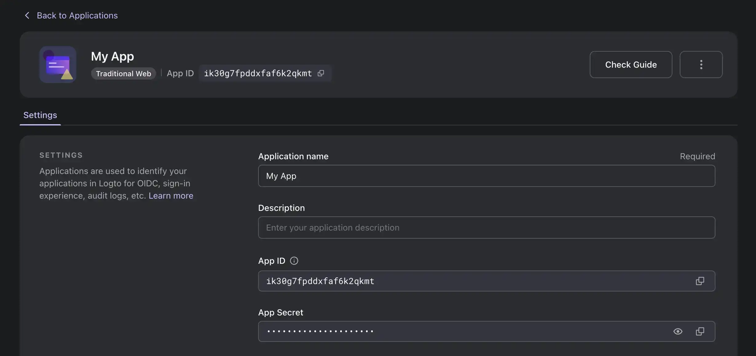 You will be directed to a tutorial page in Logto. Click on "Skip" at the top-right corner to proceed to the Application details page.