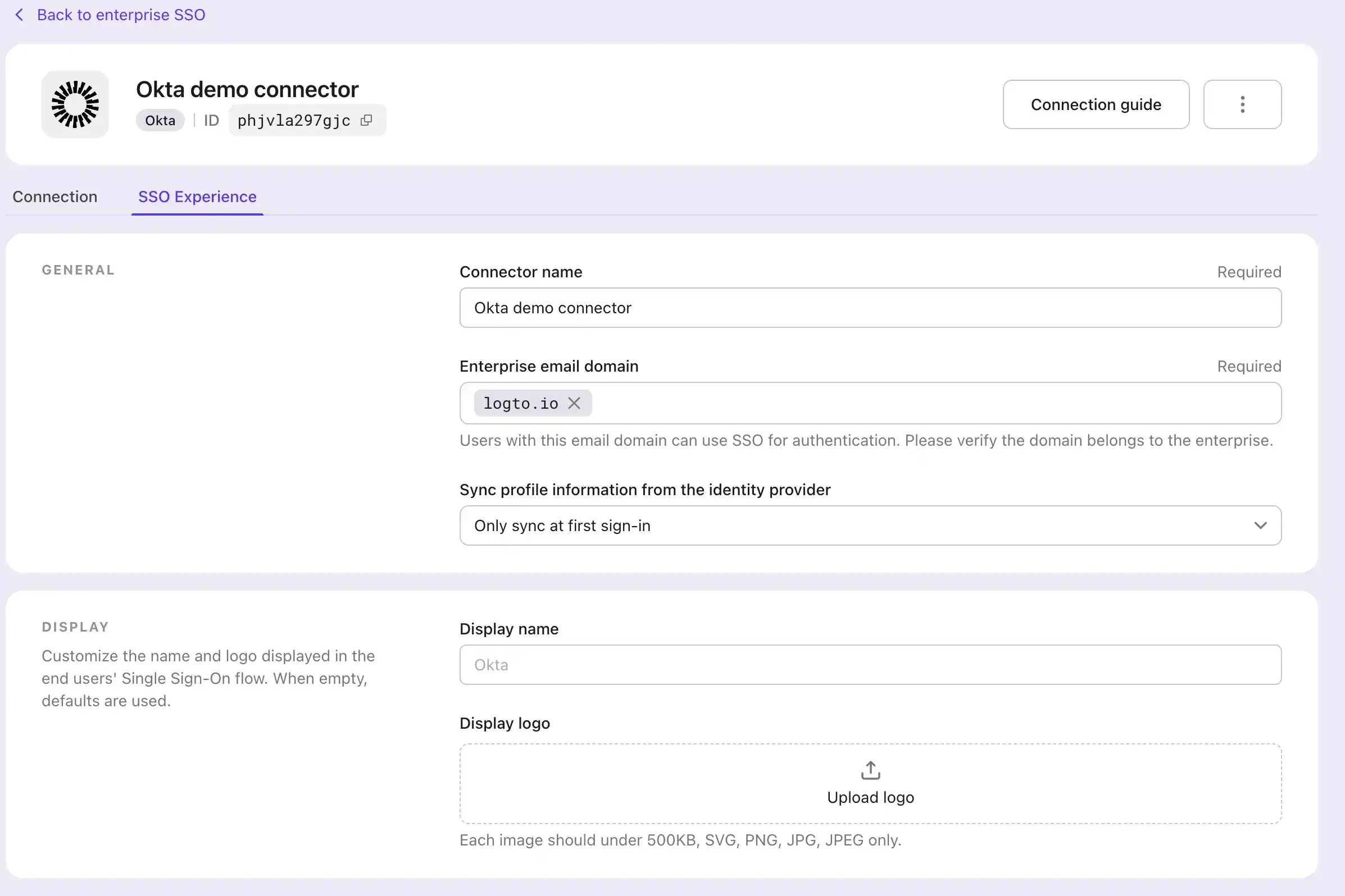 logto.ioas the enterprise email domain, all the users with an email address ends with@logto.iowill be restricted to use the Okta SSO connector to sign-in to the Logto application.