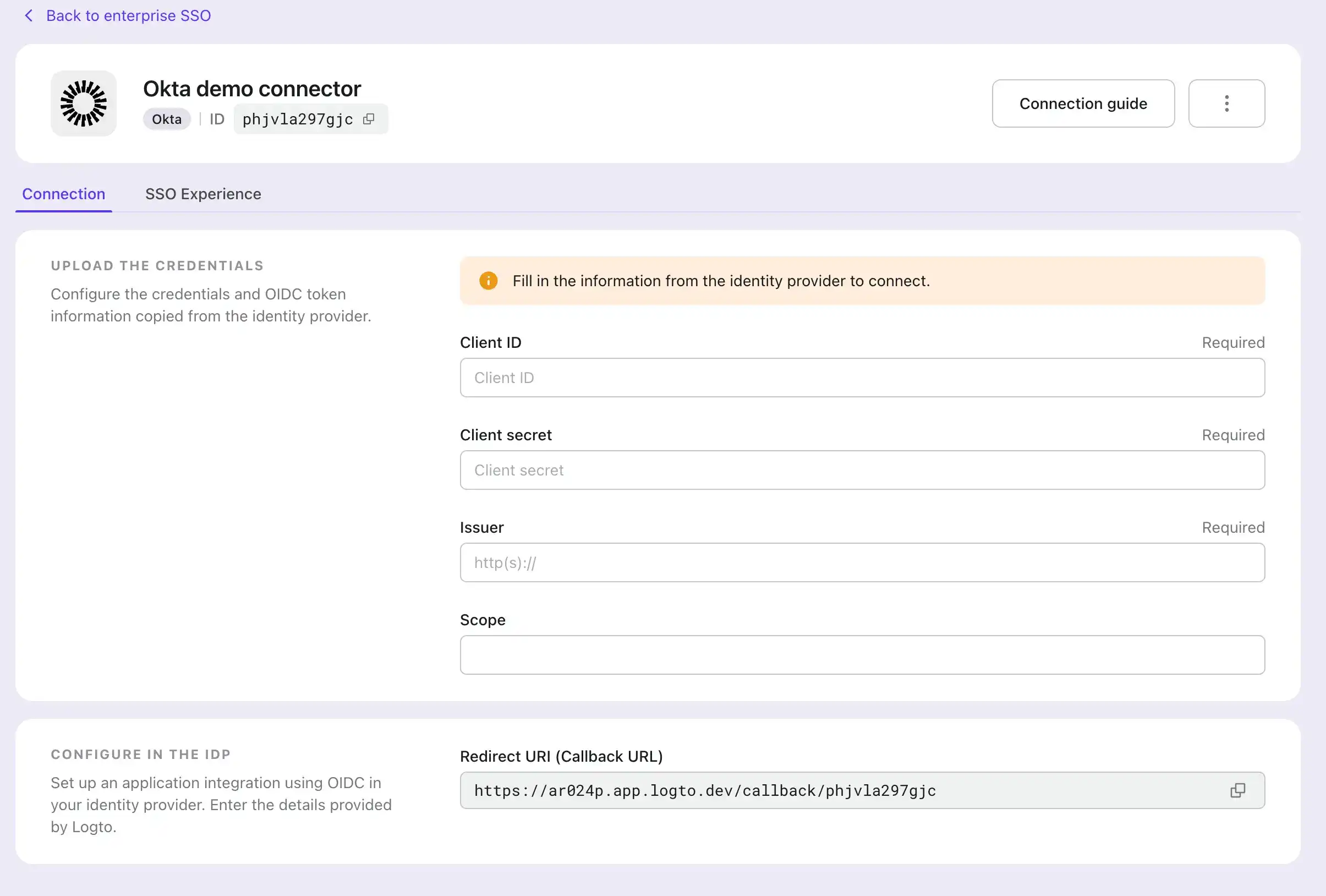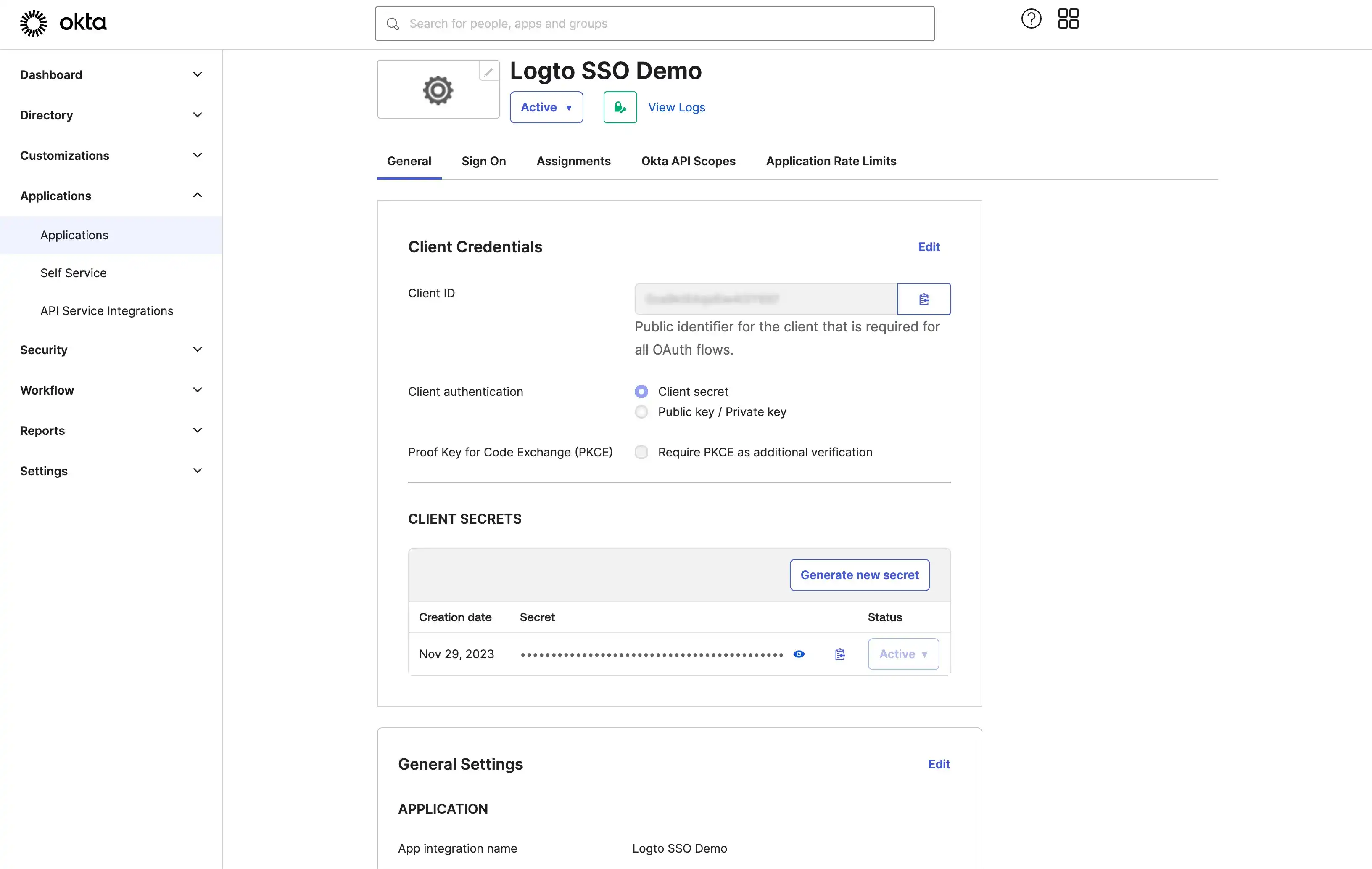 - Copy the Client ID and Client Secret from the Okta application page and paste them into the Logto Okta SSO connector page.