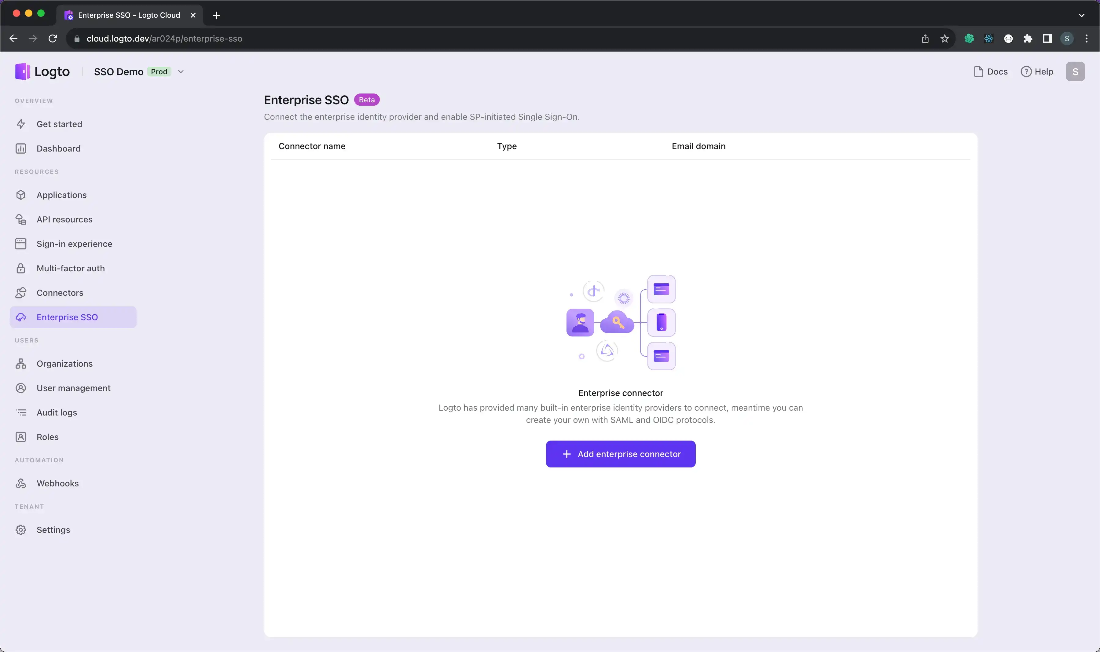 - Visit your Logto Cloud Console and navigate to the Enterprise SSO page.