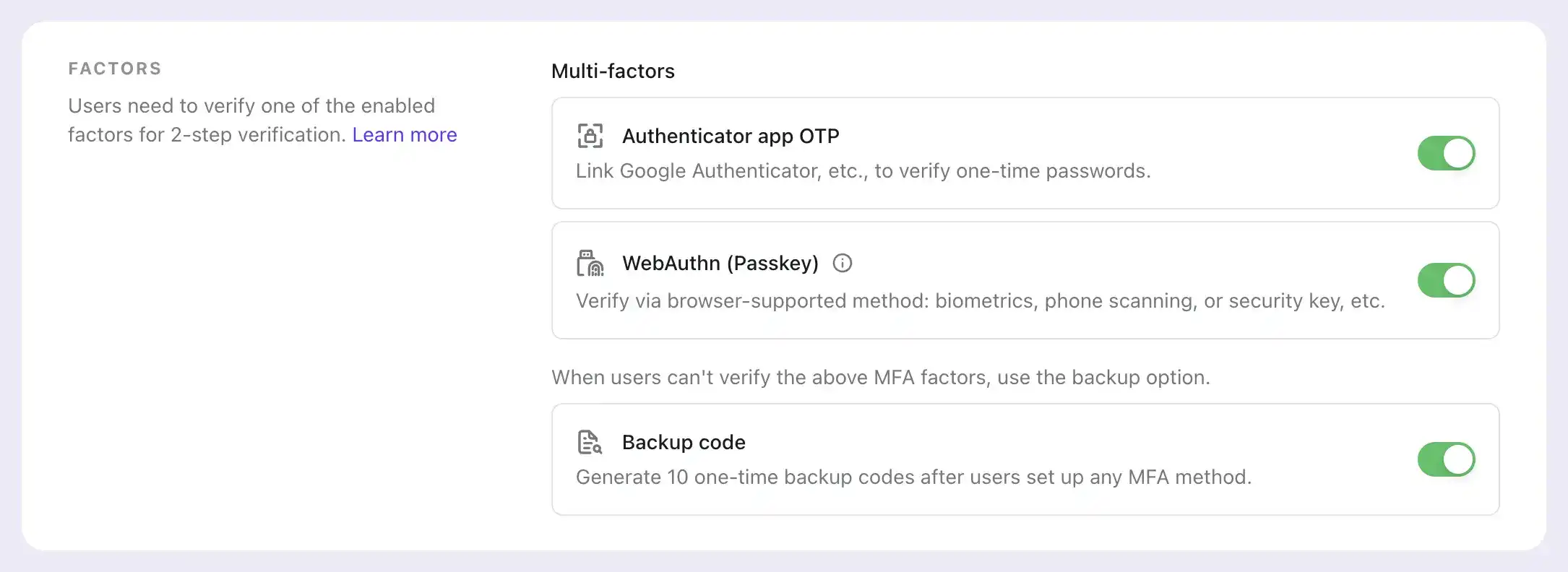 Through Logtoβs Management API, integrate the configuration abilities of the Application app OTP and Backup codes, including setup, modification, and deletion. As WebAuthn is domain-bound, it doesnβt have a management API yet, but a solution is planned. You can also manage individual usersβ authentication methods in the User management of Logto console.