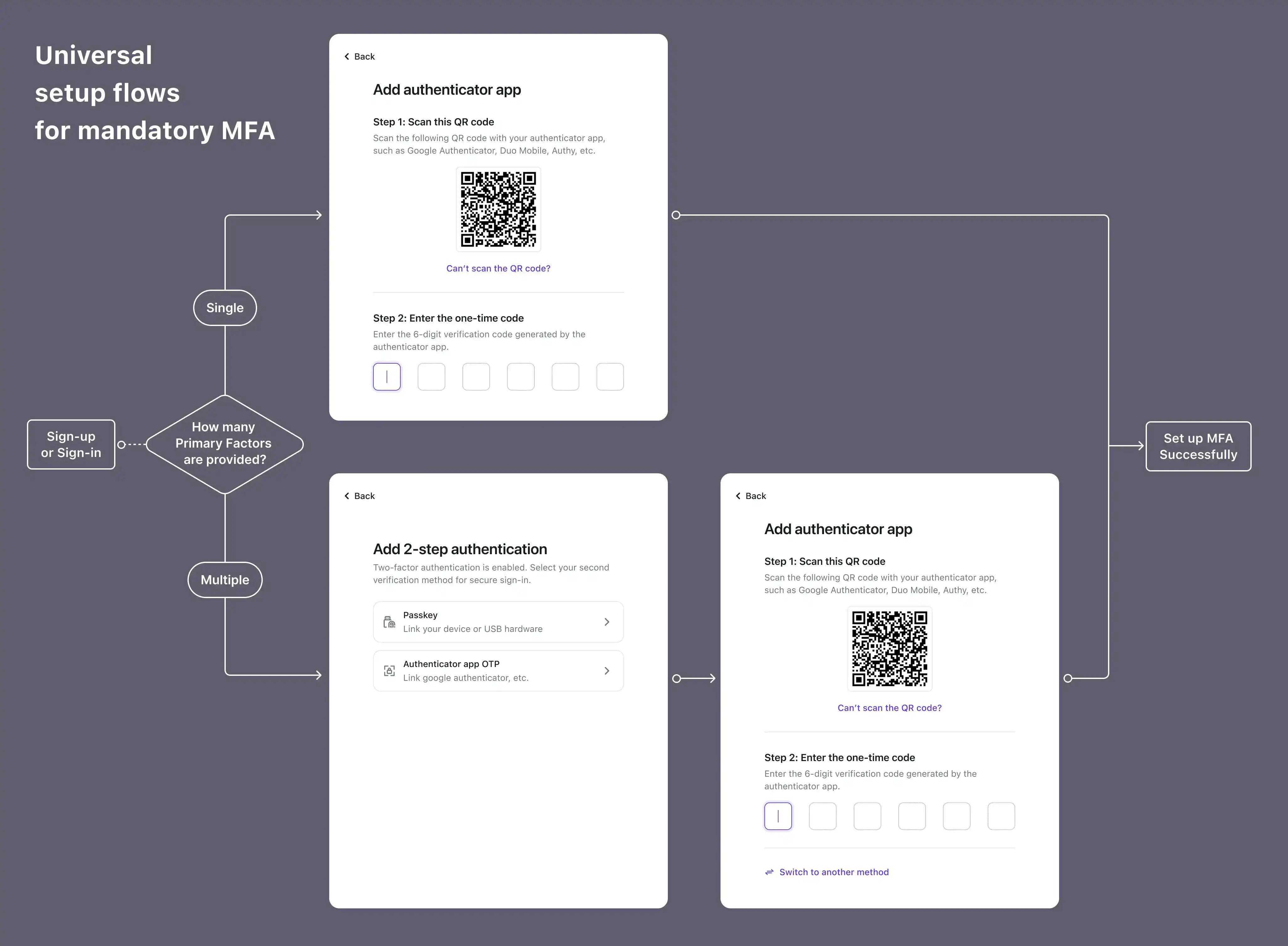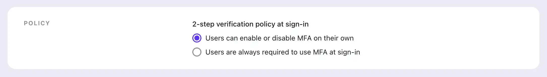 Logto offers two flavors: User-controlled MFA, ideal for consumer products or SaaS; and Mandatory MFA, suited for enterprise or financial applications.