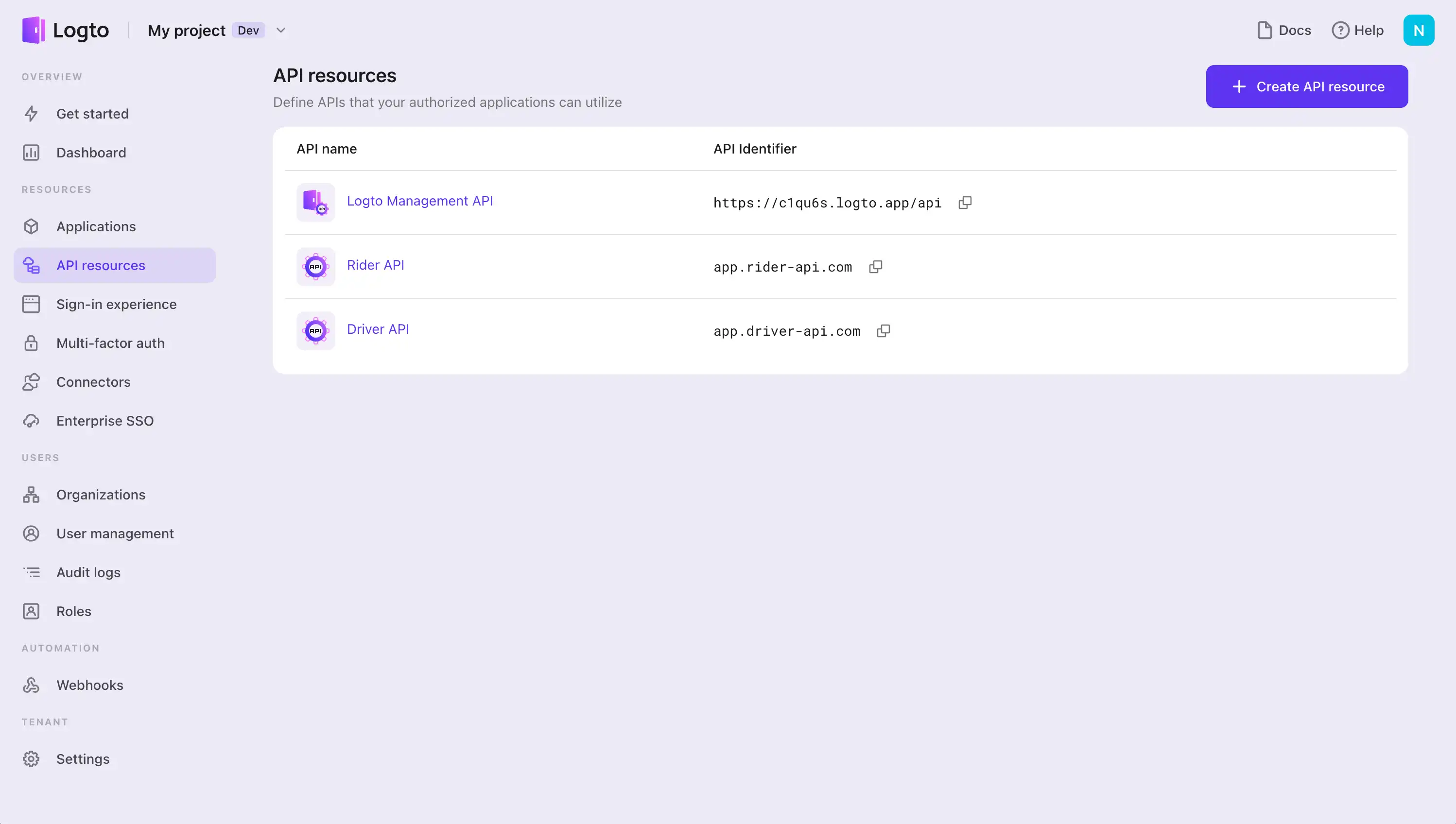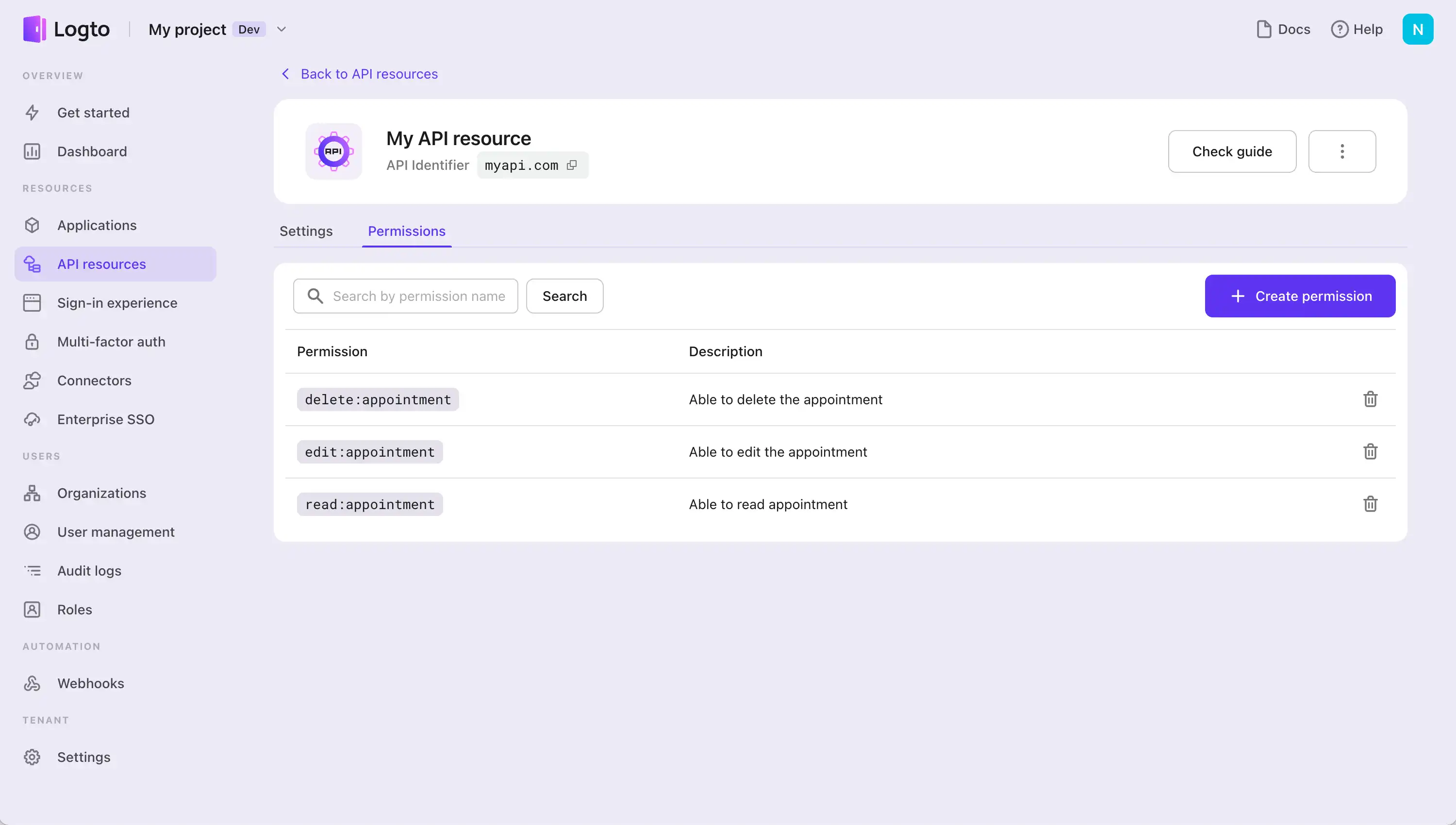Just register the API and assign permissions to each resource. Then, control access through the relationship between roles and users.
