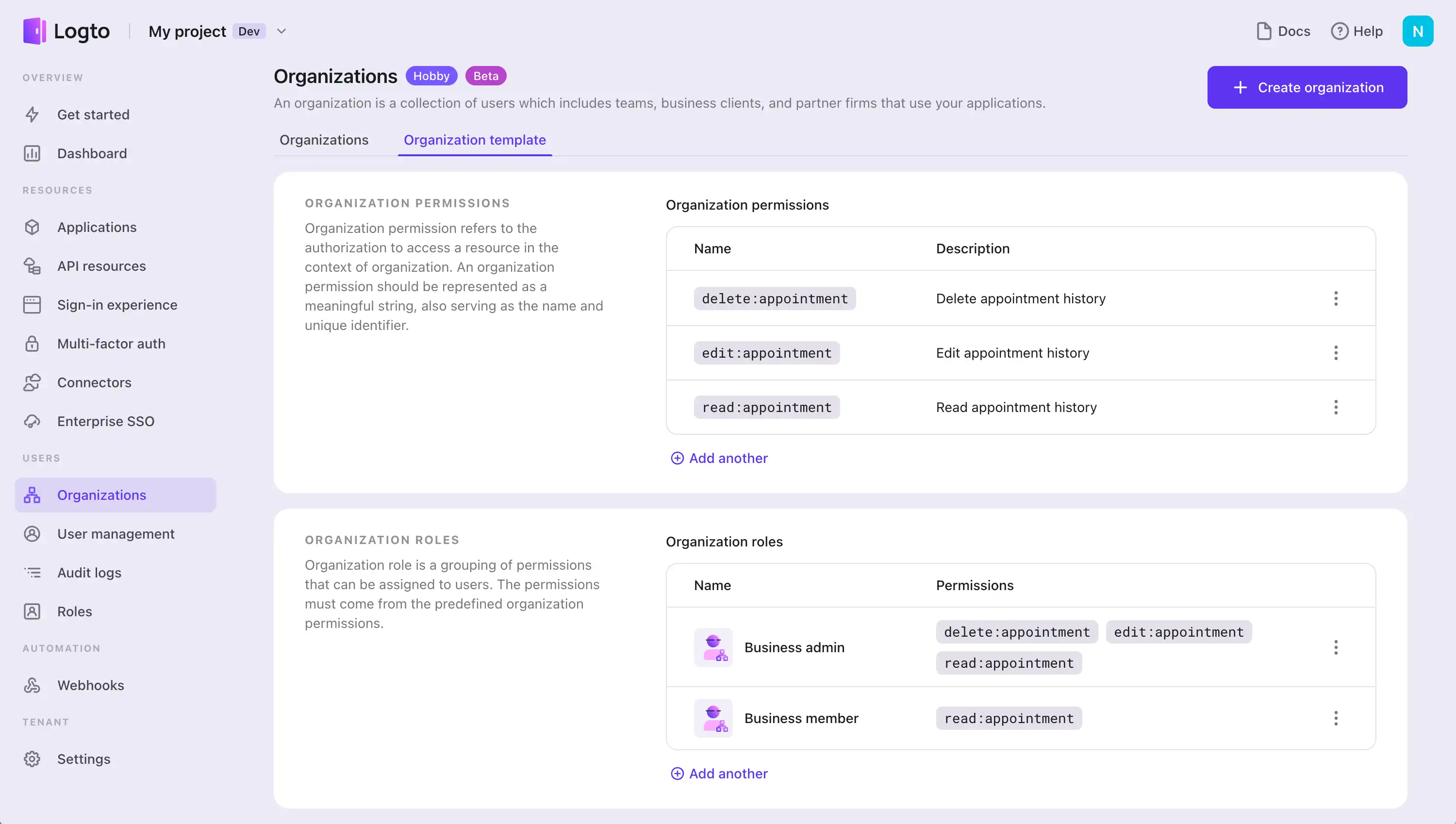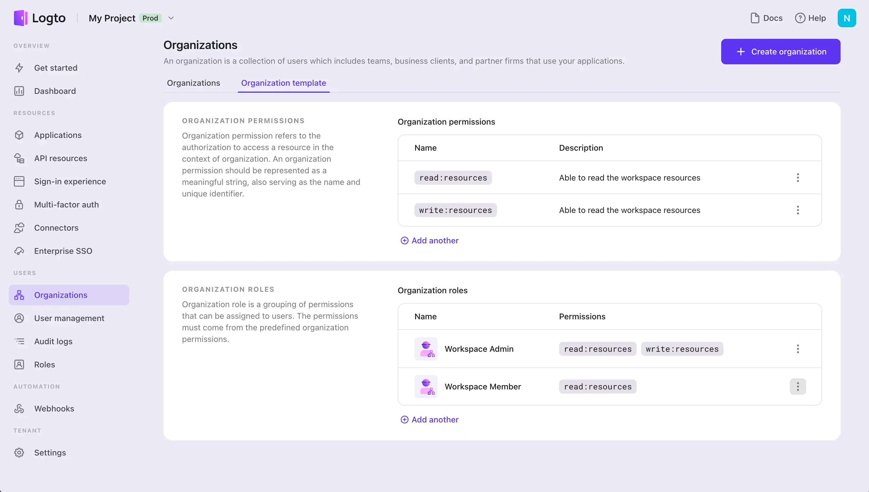 A key feature of organization RBAC is that roles and permissions are generally the same across all organizations by default, which makes Logto βorganization templateβ extremely meaningful for improving development efficiency.