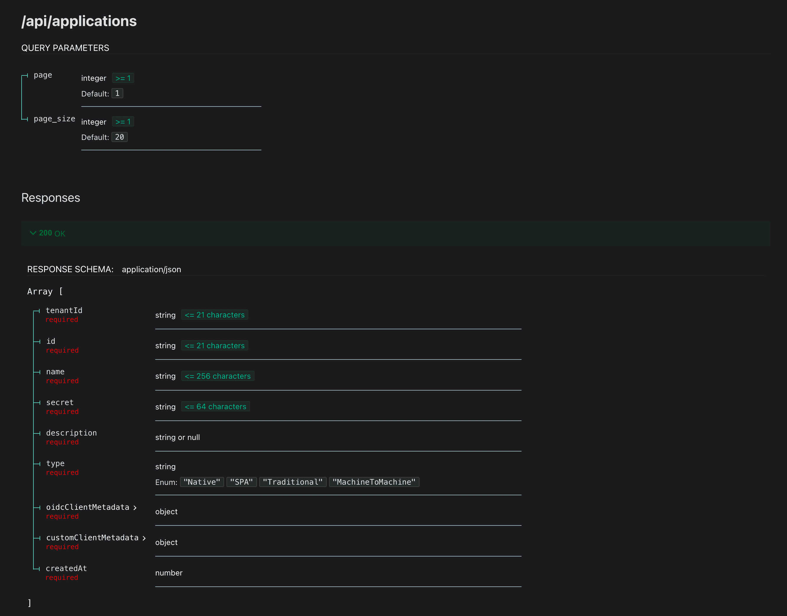 Except interaction APIs, API response schemas and status codes are now available in /api/swagger.json. Itβs also available in https://docs.logto.io/api/.