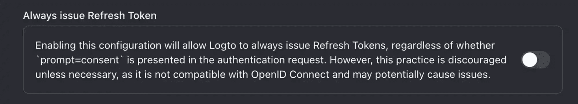 Turning on this toggle ensures that Refresh Tokens are always issued, regardless of whether prompt=consent was included in the authorization request or if offline_access was specified in the scope.