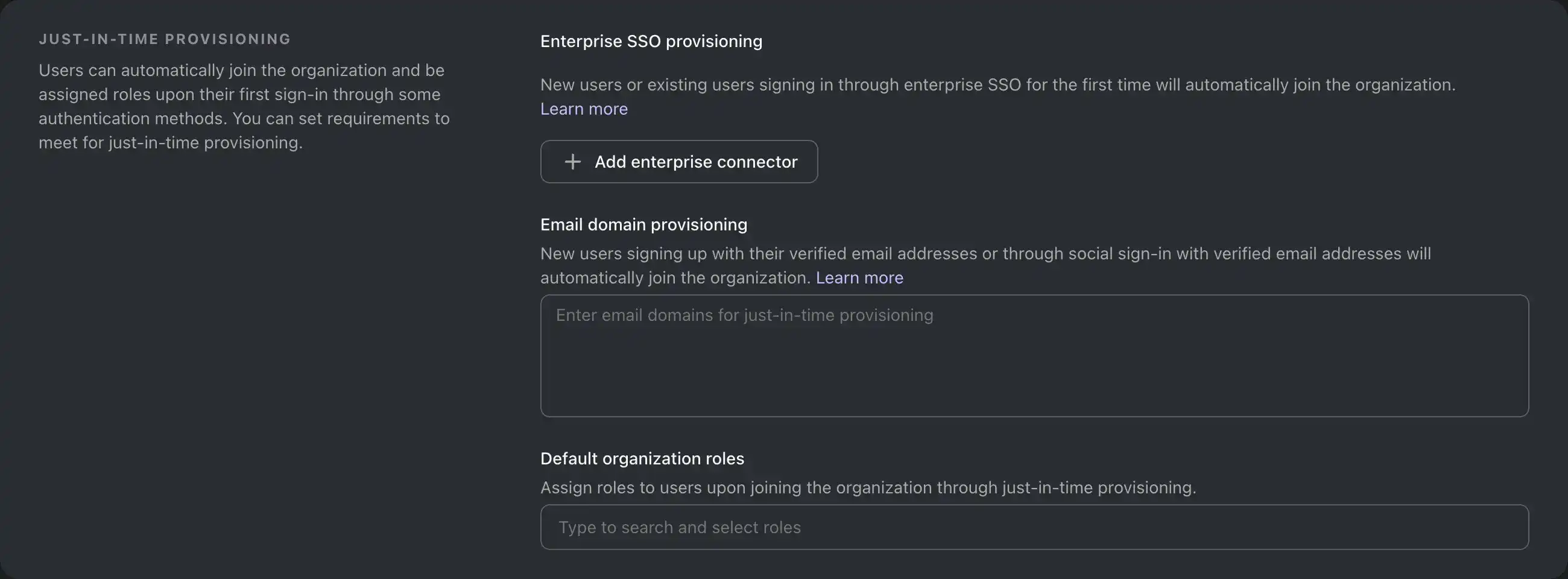 New or existing users signing in through enterprise SSO for the first time will automatically join organizations that have Just-in-Time provisioning configured for the SSO connector.