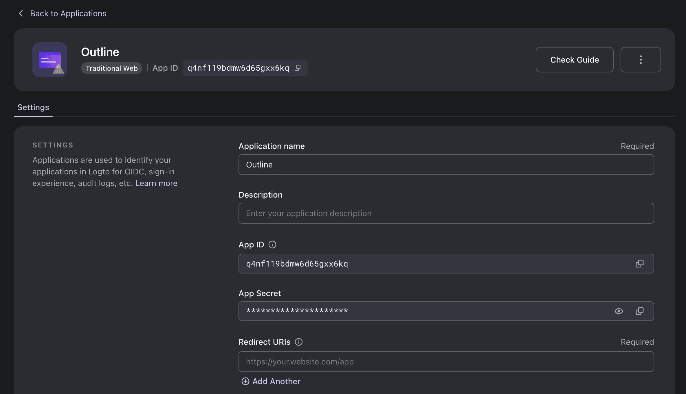 Follow the steps outlined in the Outline hosting guide until you reach the authentication configuration step. Since Outline supports OIDC-compatible authentication providers by default, you can easily find most of the required configuration values on the Logto application details page.