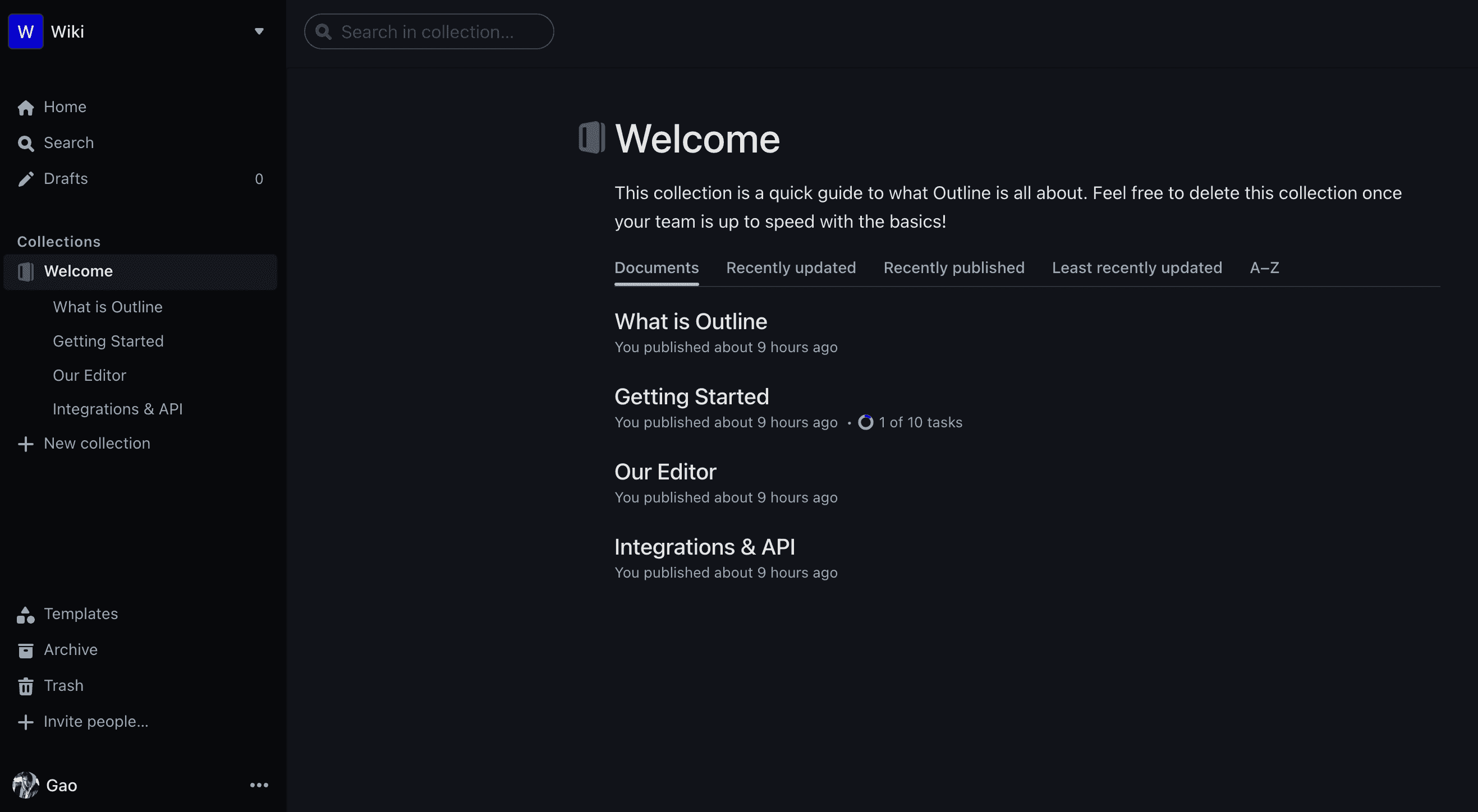 If everything has been configured correctly, once you complete the sign-in or registration process in Logto, you will be redirected back to Outline. You can then see your personal information displayed in the bottom left corner of the page.