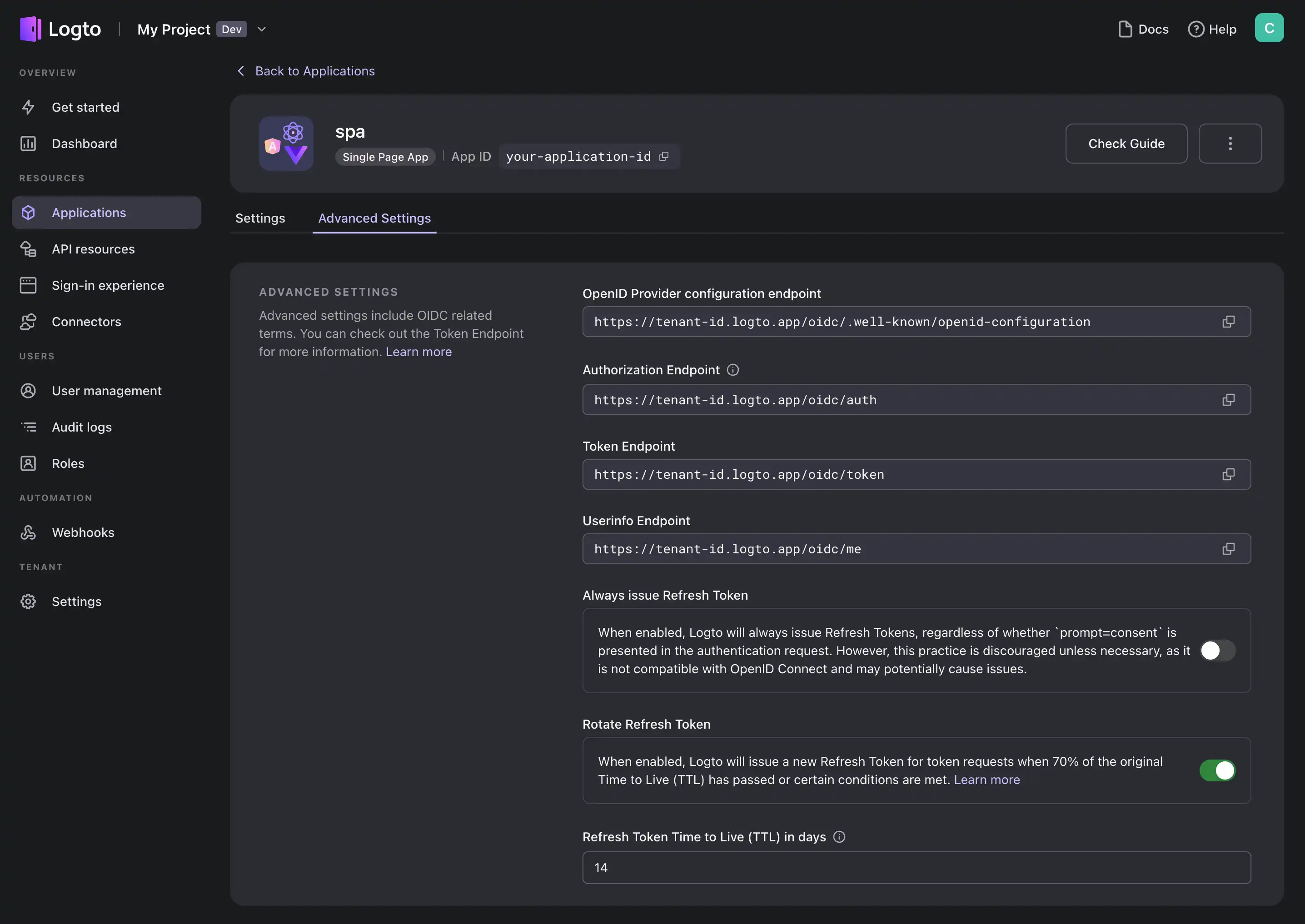 In Logto admin console, go to βApplicationsβ and select the application you would like to toggle refresh token rotation. In the application details page, go to the βAdvanced settingsβ tab, and scroll down to the bottom, you will find the switch along with some other useful settings.