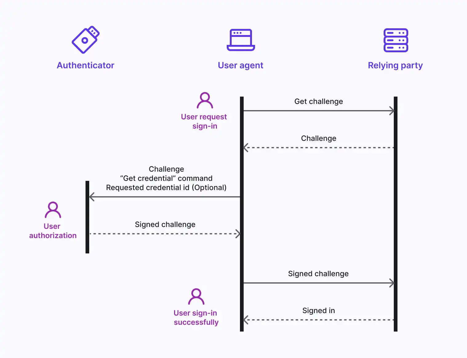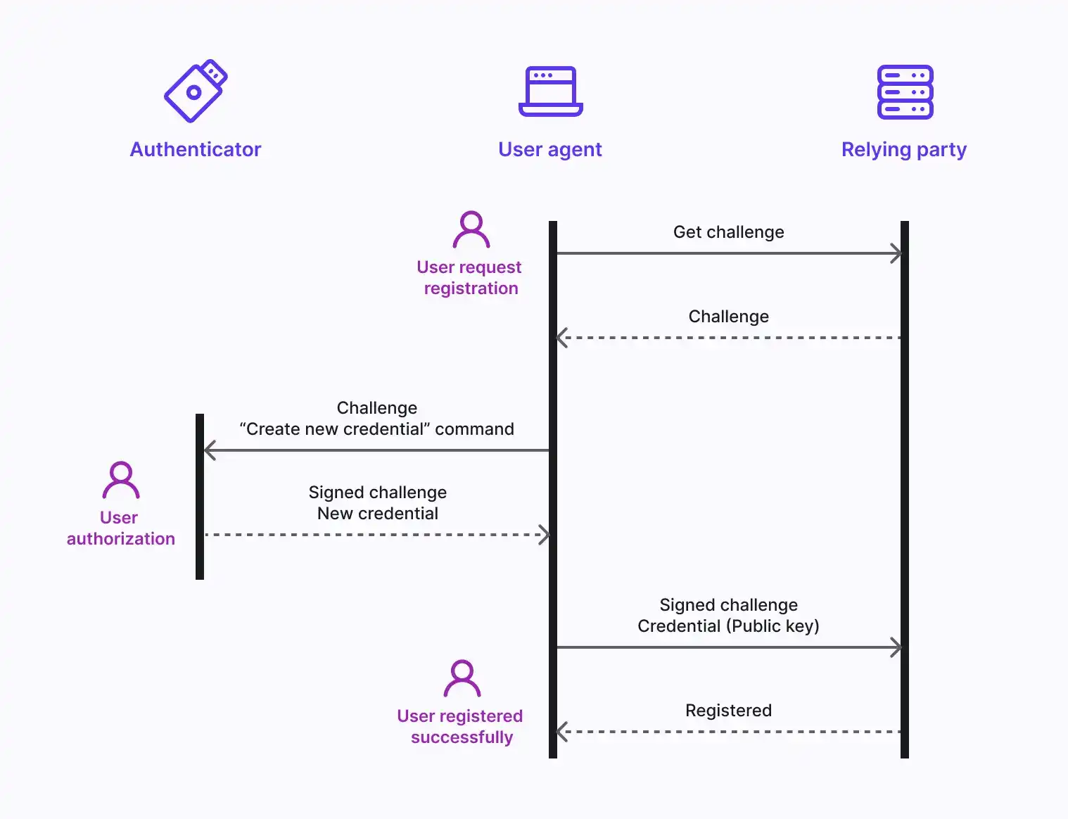 - User Verification: The User Agent sends the challenge to the Authenticator, which interacts with the user for verification (e.g., biometrics or a button press).
