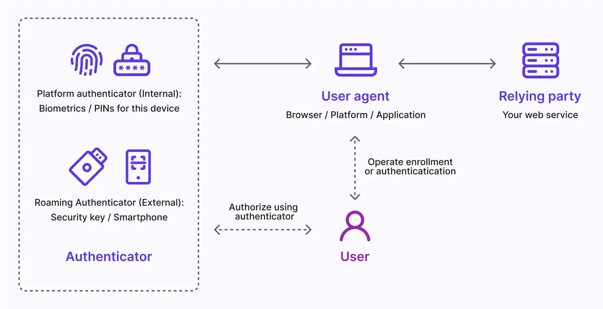 Basically, you may know the 4 main entities involved in WebAuthn flow.